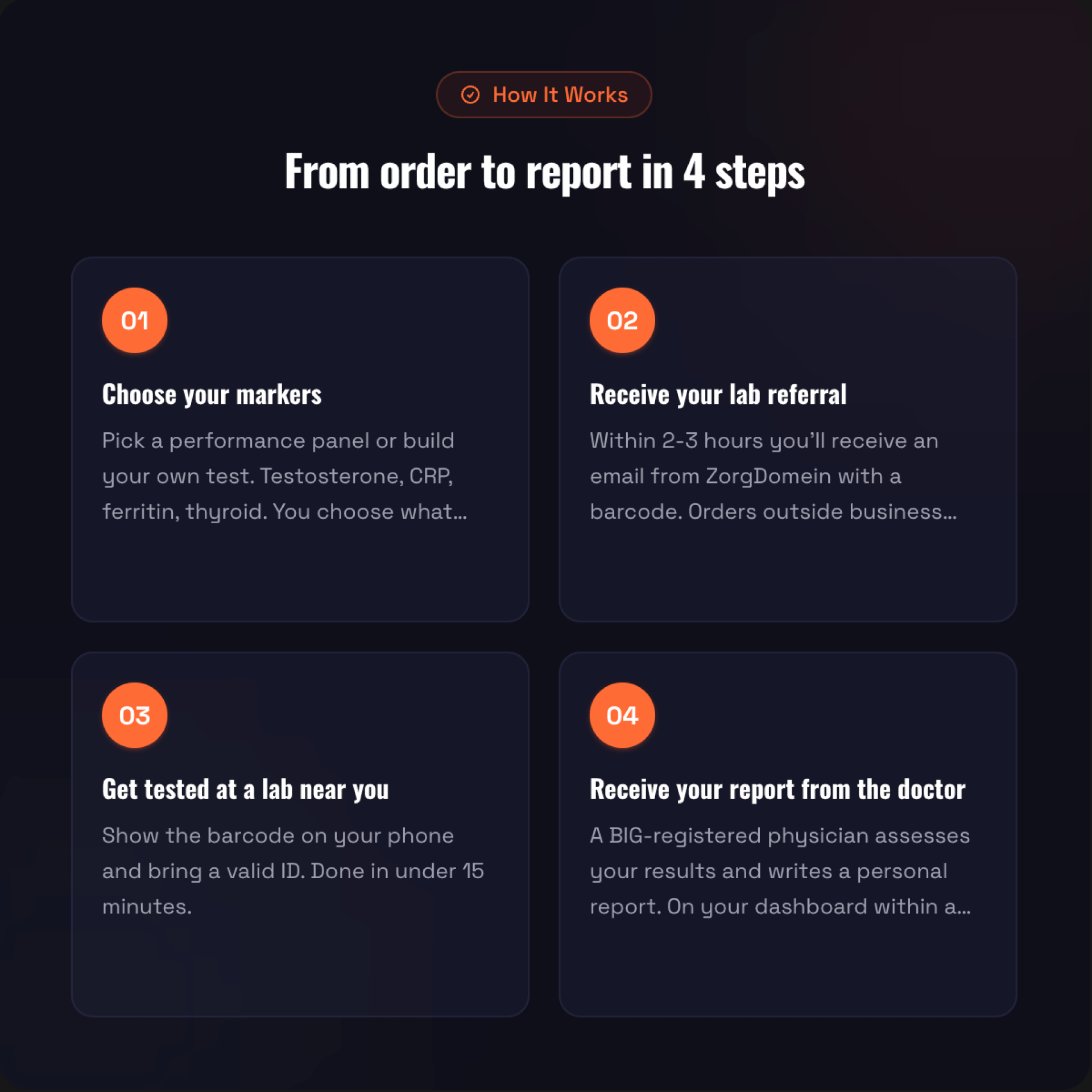 A BIG-registered physician assesses your results and writes a personal report. On your dashboard within a few business days.